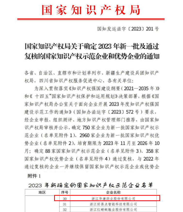 按照《國家知識產(chǎn)權(quán)局辦公室關(guān)于面向企業(yè)開展2023年度知識產(chǎn)權(quán)強(qiáng)國建設(shè)示范工作的通知》(國知辦函運(yùn)字〔2023〕572號)要求,經(jīng)過地方和國家局的層層評審,2023年11月29日,國家知識產(chǎn)權(quán)局發(fā)布了關(guān)于確定2023 年新一批及通過復(fù)核的國家知識產(chǎn)權(quán)示范企業(yè)和優(yōu)勢企業(yè)的通知,浙江華康藥業(yè)股份有限公司被認(rèn)定為“國家知識產(chǎn)權(quán)示范企業(yè)”。這標(biāo)志著繼此前獲得“國家知識產(chǎn)權(quán)優(yōu)勢企業(yè)”稱號后,華康股份在知識產(chǎn)權(quán)創(chuàng)造、運(yùn)用、保護(hù)和管理能力上邁向了新的臺階。